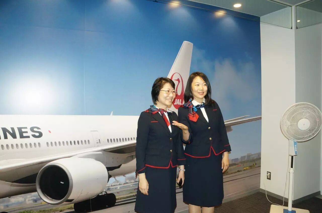 考察团一行不仅有机会试穿了空乘人员的服装,还有幸进入日航飞机整备场,近距离观察了正在机库维护的飞机。