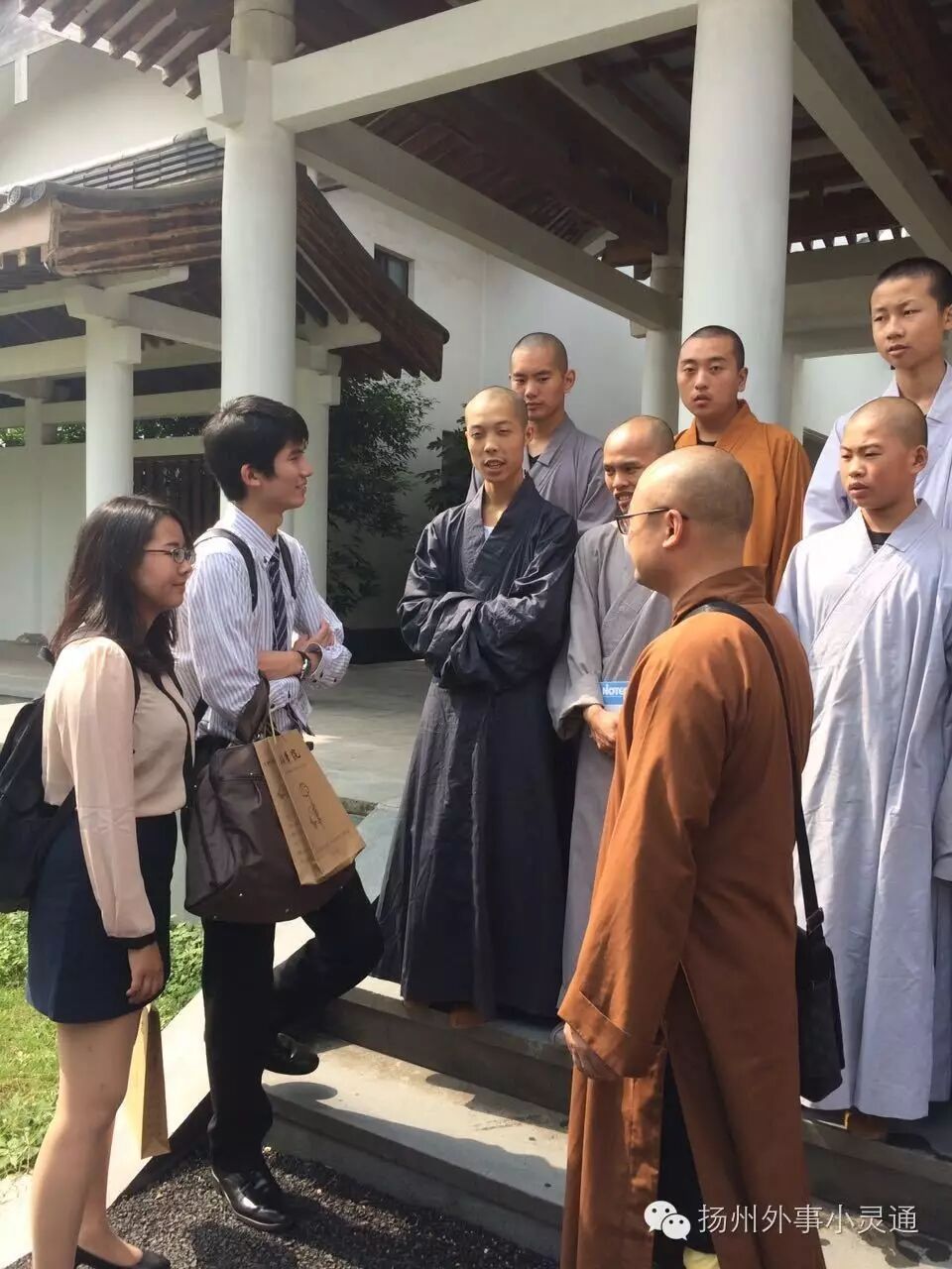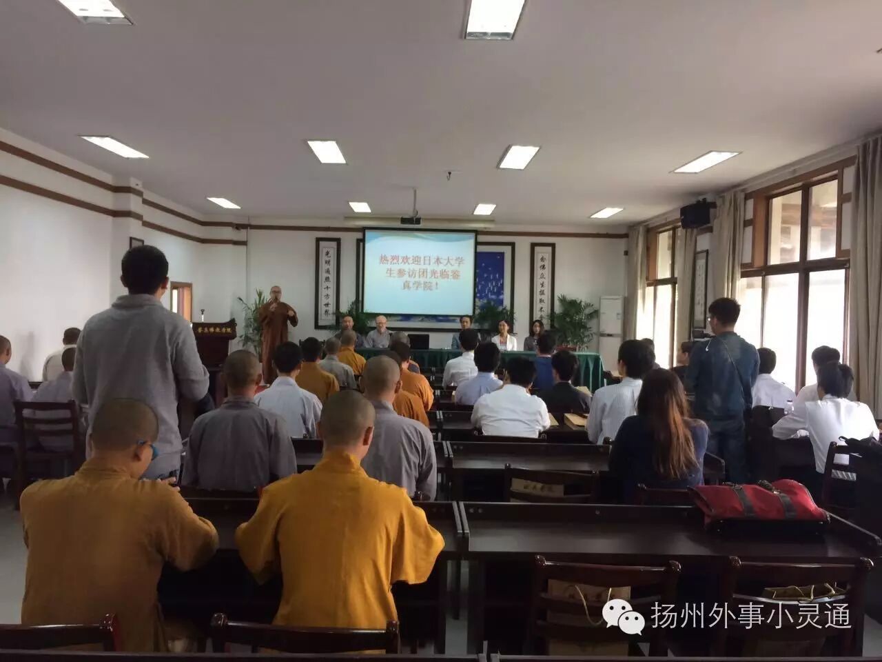 10月8日上午10时许,代表团一行到访大明寺,瞻仰了鉴真像。在大明寺仁如法师的带领下, 日方大学生一行与部分法师及一年级日语班新僧在鉴真学院进行亲切友好交流。双方秉承鉴真大师“是为法事也,何惜生命”的崇高精神,围绕学好外语的重要性以及如何推动包括年轻大学生在内的两国人民更好地继承传统和面向未来两个话题,进行了轻松愉悦的交流和分享。