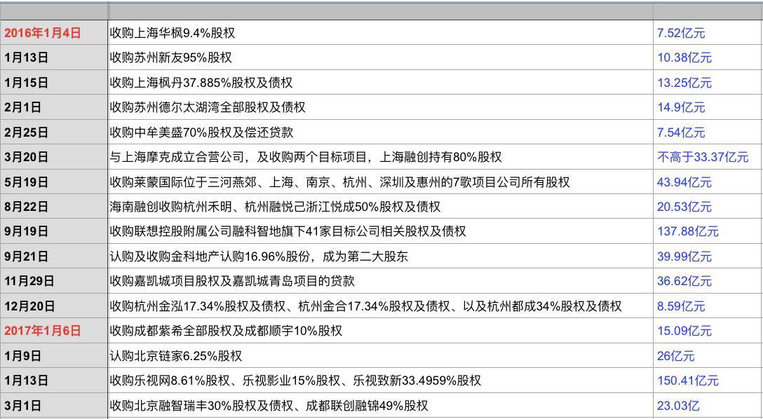 每经小编(微信号:nbdnews)在融创中国2016年财报中发现,从去年到今年3月,融创完成了16笔并购,斥资约589亿元。
