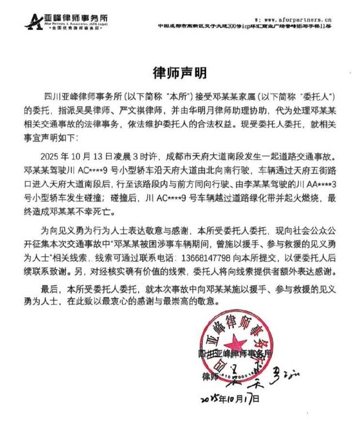 10月17日23时31分,四川亚峰天府律师事务所发布了关于前述事故的相关委托申请的律师声明。声明中称,接受邓某某家属的委托,指派吴昊律师、严文祺律师,并由华明月律师助理协助,代为处理邓某某相关交通事故的法律事务,依法维护委托人的合法权益。现受委托人委托,就相关事宜声明如下: